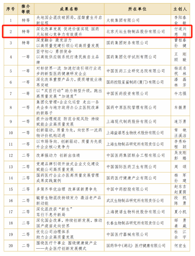 近日,第二屆(2023)國有企業(yè)深化改革實(shí)踐成果推薦活動評選結(jié)果揭曉,天壇生物《深化改革發(fā)展 促進(jìn)價(jià)值實(shí)現(xiàn) 國藥天壇核心競爭力有效提升》榮獲特等獎。此次從486項(xiàng)深化改革實(shí)踐成果中共評出特等成果30項(xiàng)、一等成果50項(xiàng)、二等成果70項(xiàng)。國藥集團(tuán)共有20項(xiàng)改革實(shí)踐成果入選,其中,獲特等獎3項(xiàng),一等獎8項(xiàng),二等獎9項(xiàng)。