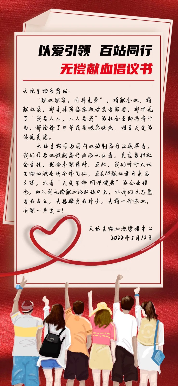 2022年6月14日,是第19個(gè)"世界獻(xiàn)血者日",天壇生物在全國各漿站組織了一場"以愛引領(lǐng) 百站同行"公益獻(xiàn)血活動(dòng)。